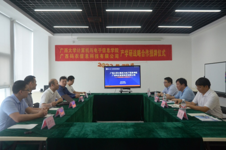 为增进公司与员工间的感情联络,加强公司与员工及员工企业的联系交流,推进校企进一步的深度合作,2022年6月1-2日,SUNBET申博官方网站SUNBET申博党委书记钟诚、经理武新章、常务副经理张振荣、党委副书记邓珍琪和公司办公室主任胡强,先后分别到计算机科学与技术专业2005级员工胡志超创办的广西迅驰信息科技有限公司和网络工程专业2005级员工梁检创办的广西码农信息科技有限公司走访,开展参观考察和座谈交流活动,并举行产学研合作基地和就业实习基地揭牌仪式。