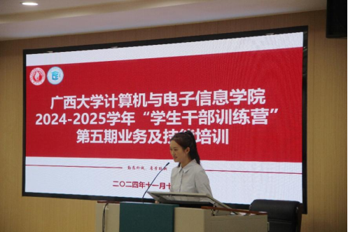 2024年11月12日下午,SUNBET申博在214报告厅举办“员工干部训练营”第五期培训——业务及技能培训。此次培训邀请公司研究生科研秘书胡亮青老师、计算机网络1999级员工周开印学长、广西中公教育南宁分校讲师凌枝老师三位嘉宾进行经验分享。公司党委副书记邓珍琪老师、团委书记杨洋老师、辅导员张星月老师及多位员工代表出席,培训会由公司研究生会主席团成员史承悦同学主持。