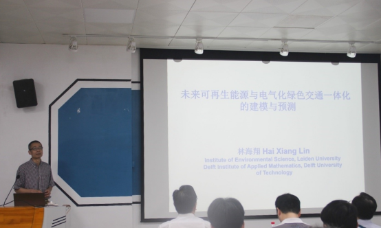 林海翔教授首先介绍了自己的一些主要经历、工作环境及其部分的研究成果。然后介绍了可再生能源和清洁交通的大背景,简述了多车充电时电网压力大、电动汽车的电池充电时间长、行驶距离短等现存的问题。由此提出了一个多学科决策支持体系和一个可行的解决方案:通过更换充电站的电池并使用备用的电动汽车电池作为存储系统来集成它们(G2V和V2G)。接下来,林海翔教授向同学们讲述了多学科决策支持体系的例子:研究未来分布式发电系统的建模和针对风光发电的随机波动设计多层分布式控制算法;利用过去三十多年的全球风光强度历史数据进行地理分布的风能和光伏发电的稳定性分析与优化;使用城市数字孪生模型对电动汽车使用以及充电和可调度容量建模和预测。随后,林海翔教授对预测模型的数学建模进行了详细解读。
