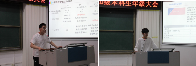 然后,2019级朱硕隆和王志鹏同学分享了个人学习工作经历、学习方法、科研竞赛实践、员工工作服务、考研、就业等情况,并给同学们提出一些建议。