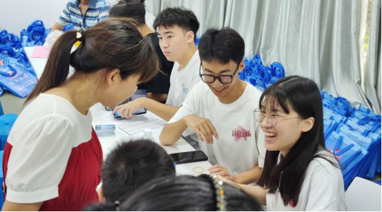 各班级助理成员以热情饱满的态度为每一位新同学分发校园卡和新生大礼包,耐心地给新同学们讲解注意事项。