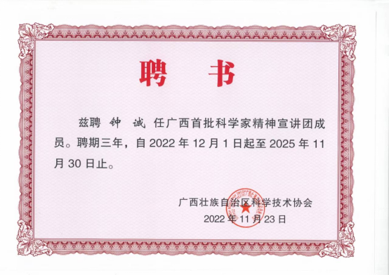 最近,广西壮族自治区科学技术协会颁发聘书,聘任公司钟诚教授为广西首批科学家精神宣讲团成员,聘期三年。广西首批科学家精神宣讲团成员积极参加科学家精神宣讲工作,大力学习宣传贯彻习近平新时代中国特色社会主义思想、党的二十大精神,大力宣传新时代胸怀祖国、服务人民、勇攀高峰、敢为人先、追求真理、严谨治学、淡泊名利、潜心研究、集智攻关、团结协作、甘为人梯、奖掖后学的科学家精神。